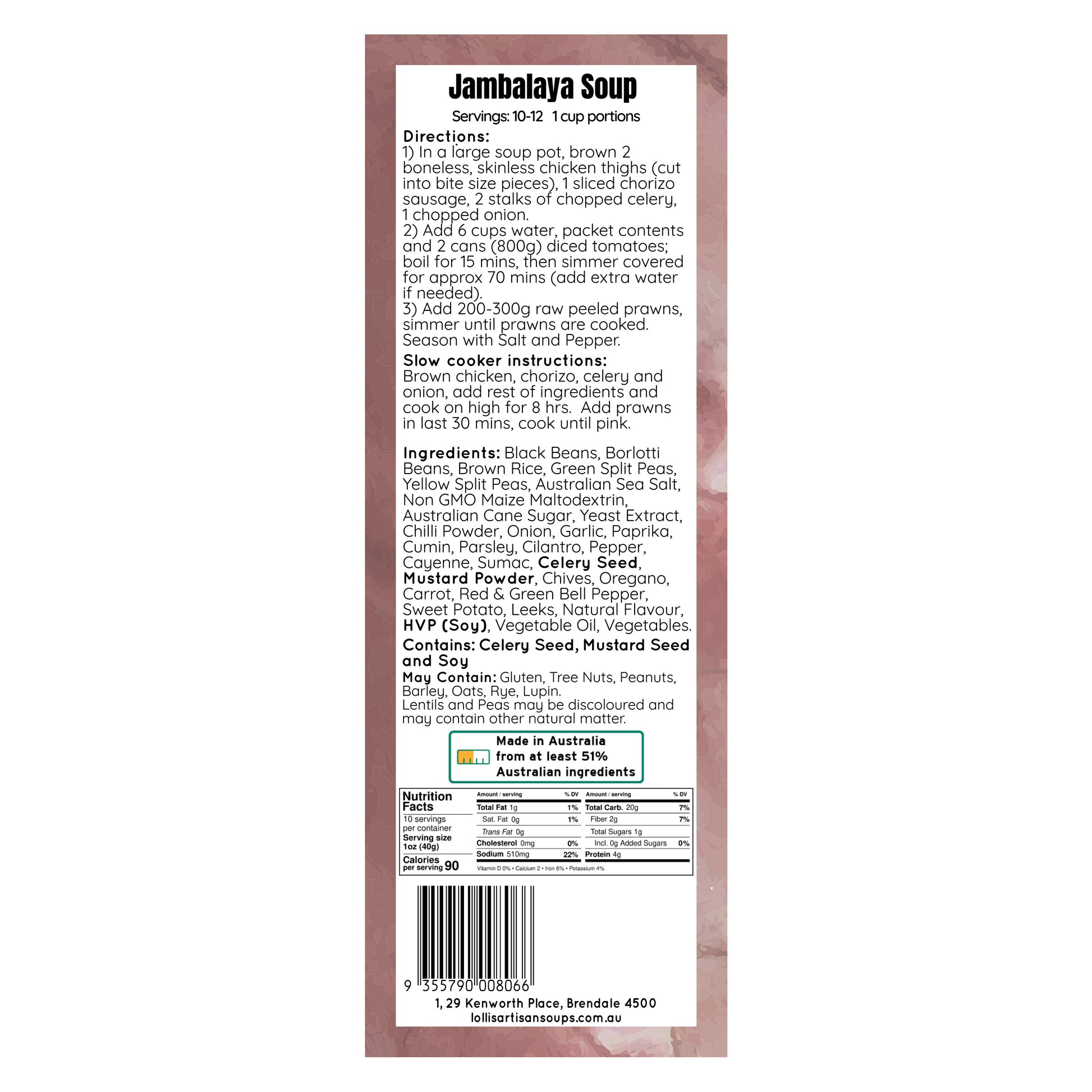 Black Beans, Borlotti Beans, Brown Rice, Green Split Peas, Yellow Split Peas, Australian Sea Salt, Non GMO Maize Maltodextrin, Australian Cane Sugar, Yeast Extract, Chilli Powder, Onion, Garlic, Paprika, Cumin, Parsley, Cilantro, Pepper, Cayenne, Sumac, Celery Seed, Mustard Powder, Chives, Oregano, Carrot, Red & Green Bell Pepper, Sweet Potato, Leeks, Natural Flavour, HVP (Soy), Vegetable Oil, Vegetables.